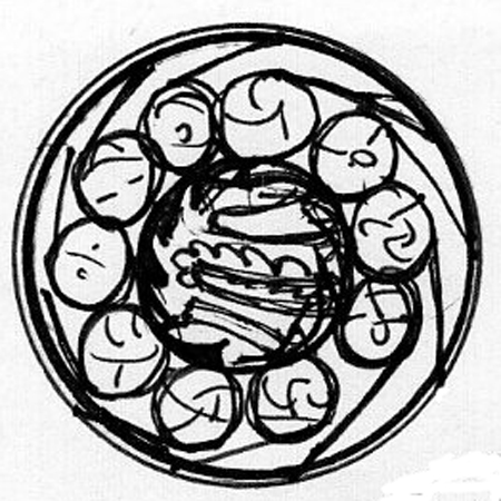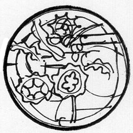 After the presentation, we continued to refine the artwork. Yuka took charge now, bringing the rough comp to a more completed stage with work that accurately reflects the style we’ll be using for our painted faces. She finished her design in watercolor, the traditional medium for design roughs in glasswork.
