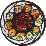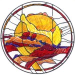 We chose to use heavily textured glasses to catch and hold the light. We set fragments of fused glass, rippled glass, and hand-spun rondels into a background of mouth-blown reamy glass.