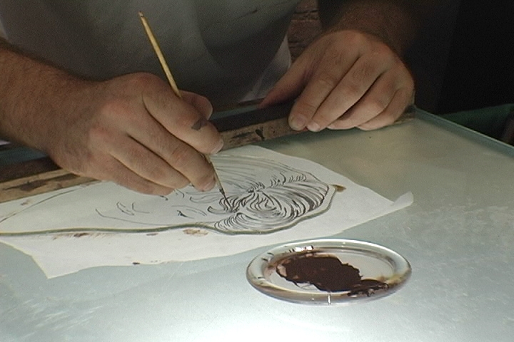 To reproduce the broken glass, the first thing we do is create a drawing of the face. We use this drawing to paint the facial lines and features onto the glass.