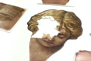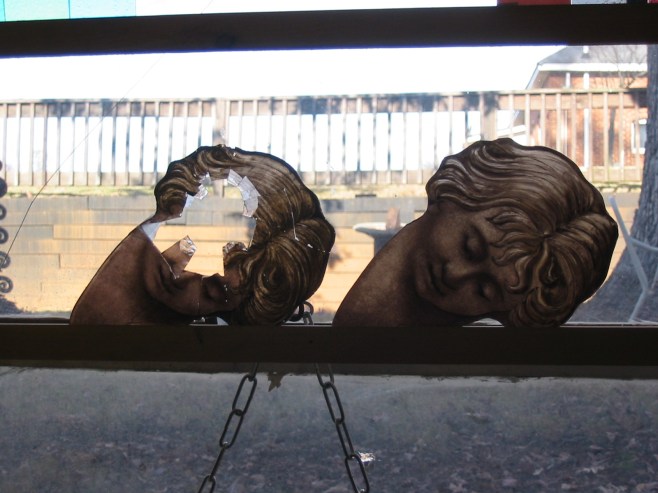 Many restoration projects involve recreating a replacement for a shattered or missing piece of glass. Our restoration of windows for St. Peter’s Episcopal Church in Rome, Ga involved painting a face to match one shattered by a golf ball, of all things. Here is the broken face.