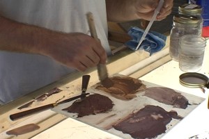 Pictured below, we start to apply the flesh tone foundation for the face. Once we finish the painting, the glass paint is permanently melted to the glass inside a kiln heated to approximately 1250’F.