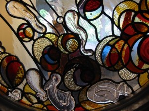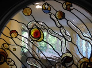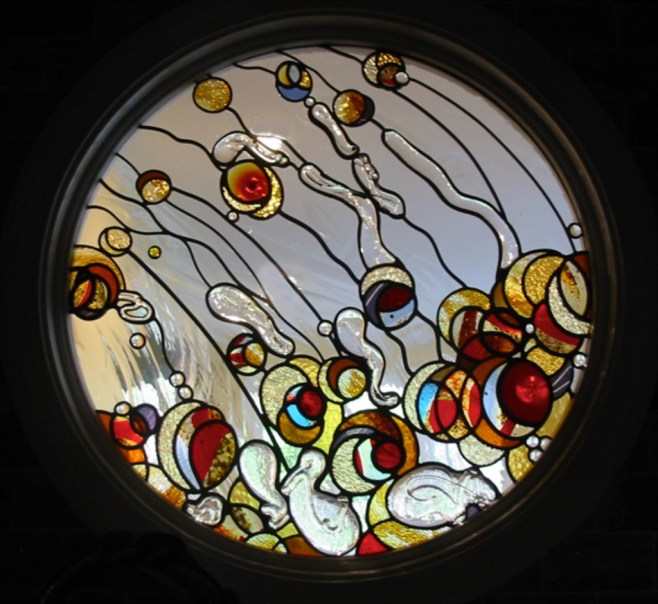 We also formed glass shapes with molten glass dripped from the end of a steel pole called a punty rod. I got the idea to use the punty rod technique because the client keep calling this the “bubble window.” The punty rod formations have a real organic shape and give the window a nice sculptural relief and texture.