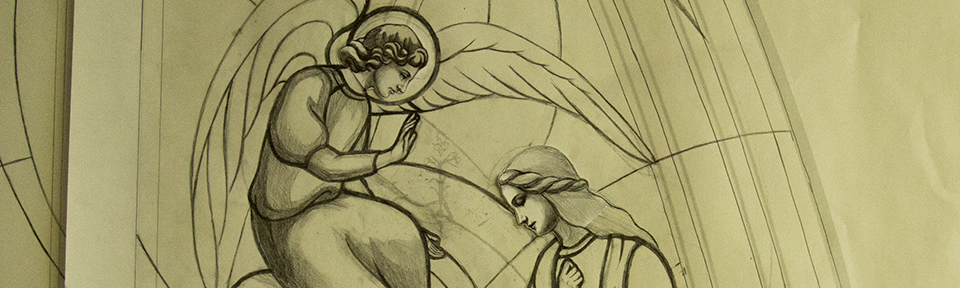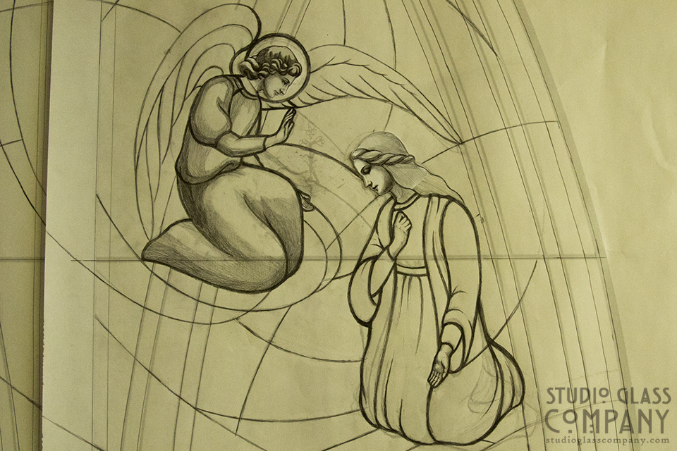 While we were completing the Matthew window for St Matthew’s Catholic Church, we were already moving on to their next commissioned window. The Joseph window’s companion piece, both smaller windows at the church’s apse, was to be a window of Mary and a few critical scenes in her story: the Annunciation, the Visitation with Elizabeth, and the Nativity. We were given a reference picture to go by and from there were left largely to our own devices in the design.