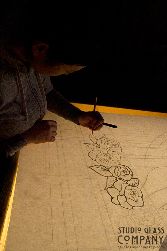 Once the final design is chosen, I create several full scale patterns of the window which I use like blue prints to build the window.