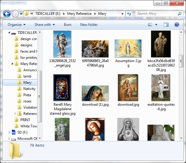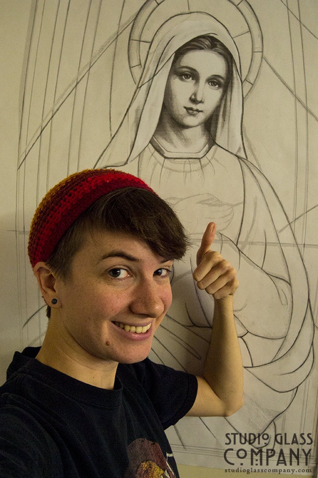 We started the design process with research, lots and lots of research. We looked up pictures of other stained glass of Mary, of paintings of her and her various scenes, as well as motifs and symbolism the Catholic church ascribes to her.